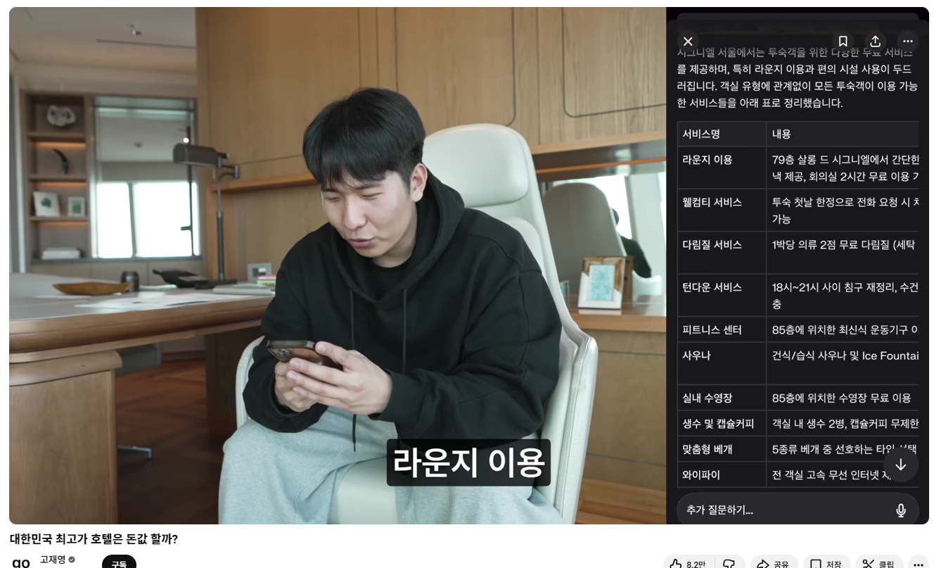 실제로 퍼플렉시티 PPL 콘텐츠 중 조회수가 높은 사례는 ‘고재영’ 채널의 <대한민국 최고가 호텔은 돈값 할까?>입니다. 이 영상은 ‘시그니엘 서울 후기’라는 강한 생활형 키워드로 유입을 끌어오고 그 안에서 “호텔에서 실제로 누릴 수 있는 서비스”를 표로 정리해 비교해주는 방식으로 퍼플렉시티를 활용합니다.