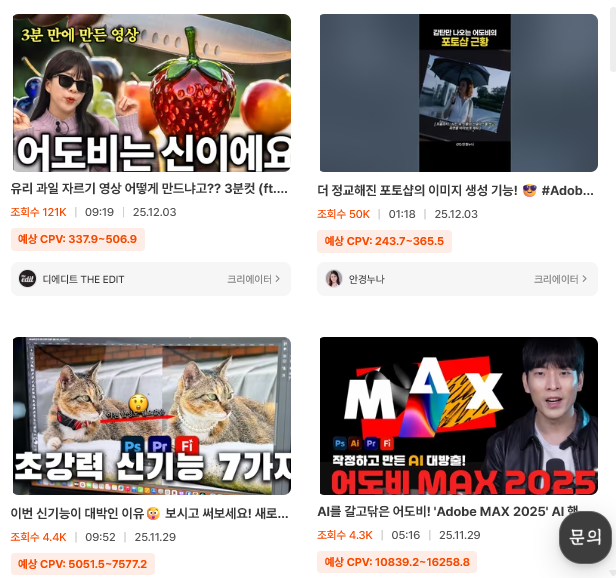 그래서 어도비 PPL은 특히 ‘실무형 교육 강의 콘텐츠’에서 힘이 세집니다. 디자인이나 영상 편집을 직접 하는 사람을 타겟으로 하기 때문에 제작 과정을 가진 크리에이터일수록 어도비의 메시지를 훨씬 자연스럽게 전달할 수 있고 결과적으로 교육 강의 영상에 가까운 형태로 보이게 되죠.