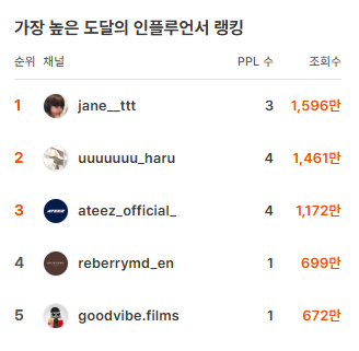 단순히 순위를 나열하는 것이 아니라 실제 조회수와 협업 규모를 기준으로 지금 시장에서 어떤 인플루언서들이 영향력을 만들고 있는지를 함께 살펴보려고 합니다.