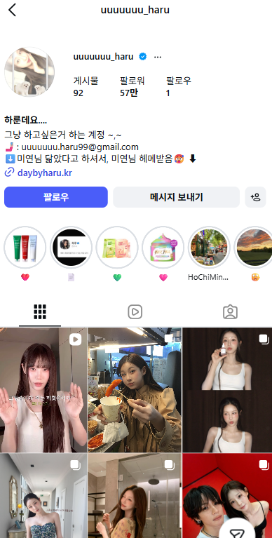 uuuuuuuu_haru는 메이크업·헤어 중심의 뷰티 계정으로 전형적인 비주얼 중심 콘텐츠(눈호강형)를 만드는 크리에이터입니다. 콘텐츠 자체가 무드 있는 연출 위주라 자연스럽게 팔로우를 유도하는 구조를 가지고 있죠.