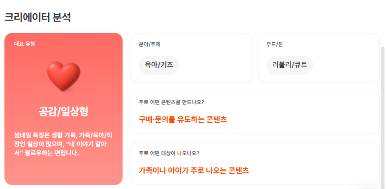 콘텐츠 유형도 ‘공감/일상형’으로 가족이나 아이가 등장하는 생활 밀착형 콘텐츠가 중심입니다. 이런 콘텐츠는 광고라도 거부감이 적고 자연스럽게 구매나 문의로 이어지는 흐름을 만들기 쉽죠.