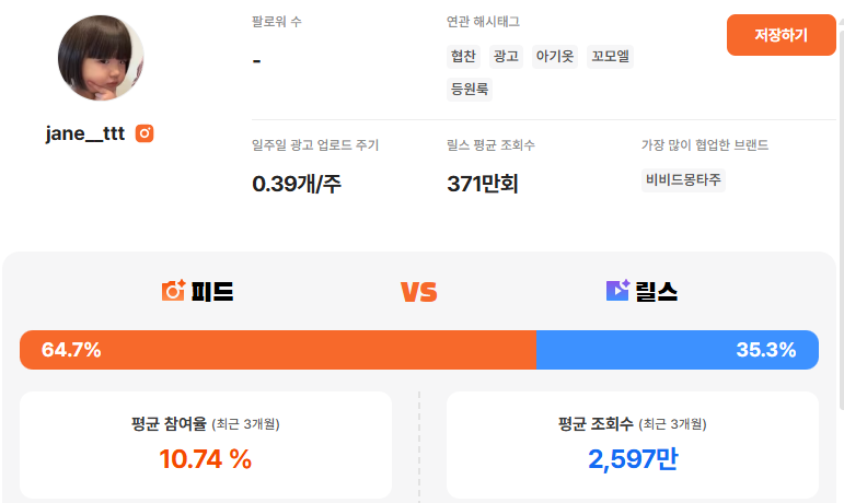 예를 들어 피드와 릴스 비중, 참여율, 조회수 흐름을 통해 이 계정이 어떤 포맷에서 강점을 가지는지 확인할 수 있고 광고 콘텐츠와 일반 콘텐츠 성과를 비교해 “이 크리에이터가 광고에서도 반응이 유지되는 타입인지”까지 미리 파악할 수 있습니다.