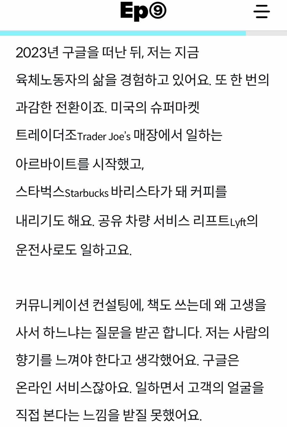 재작년에 당시 구글 본사에서 일했던 50대 여성이 쓴 <계속 가봅시다 남는 게 체력인데>라는 책을 읽으며 저자의 꾸준하게 도전하는 태도가 인상적이었는데, 최근에는 구글을 나와서 다양한 일을 시도 중인가 봐요. Ep9을 읽으며 알게 됐는데 육체를 쓰는 일도 한대요. 세상을 알기 위해 기존의 경험과 다른 시도를 하는 사람을 보면, 그 유연함을 배우고 싶어요.