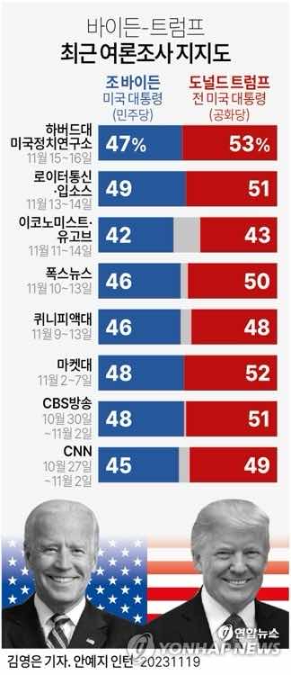 미국 대선이 일년도 채 남지 않은 가운데, 미국 주요 여론조사에서 민주당의 차기 유력 대선 후보인 현 미국 대통령 조 바이든이 공화당의 유력 대선 후보인 도널드 트럼프에게 모두 밀렸다는 결과가 발표됐어요.