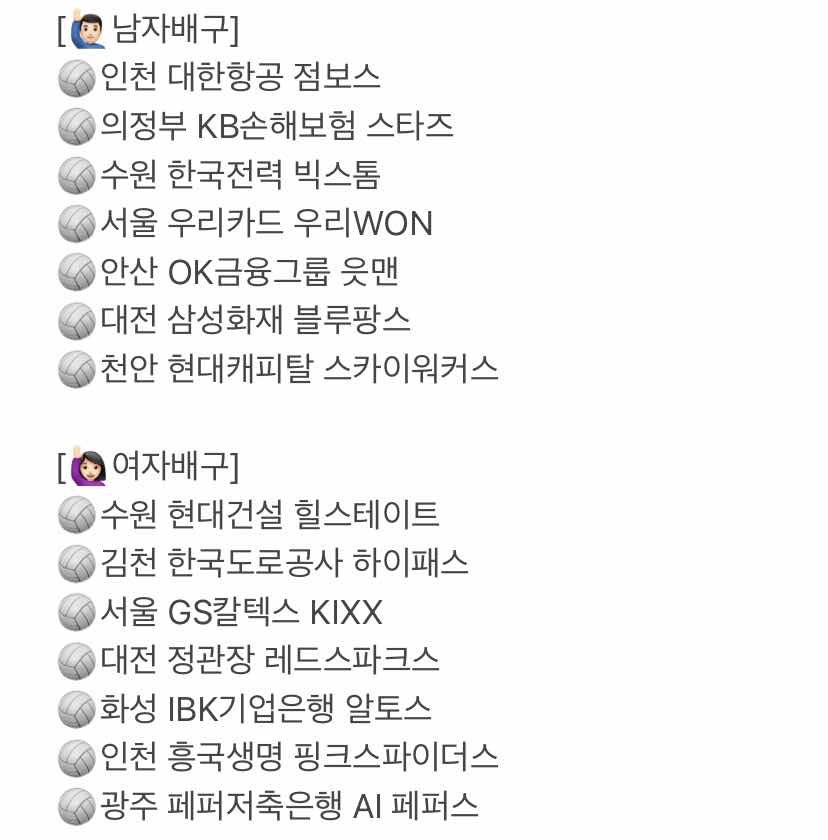 사진에 배구 팀들을 정리했으니 연고지부터 살펴보고, 가까운 지역에 있는지 확인해봐요!