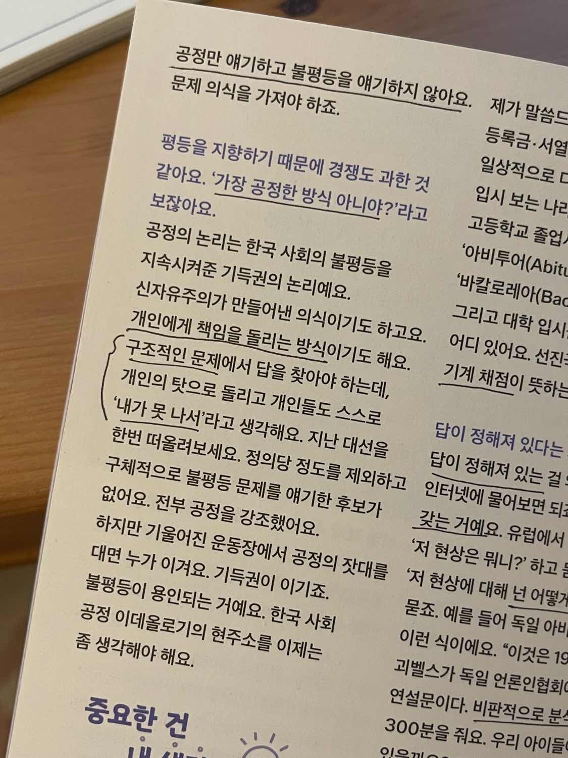 매거진을 다 읽고 덮은 뒤에 가장 인상 깊게 남은 이야기는 중앙대 김누리 교수님의 인터뷰예요. 우리나라가 자본독재라는 점, 공정을 앞세우면서도 불평등을 얘기하지 않는다는 점. 경쟁을 공정하다 생각하고 스스로 탓하던 저에게 신선한 충격이었답니다.