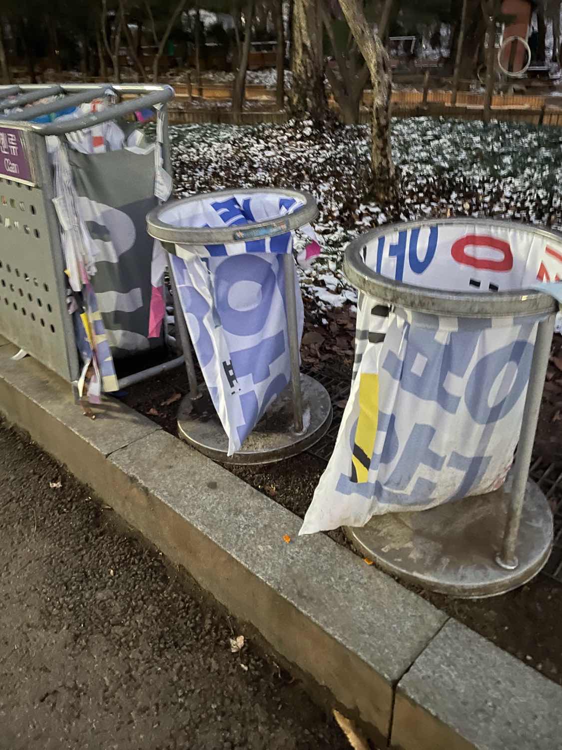 오늘 공원을 걷다가 현수막으로 만든 쓰레기통을 발견했어요! 그냥 일반 쓰레기로 버리는 것보다 쓰레기봉투로 활용하는게 좋은 아이디어 같더라구요.