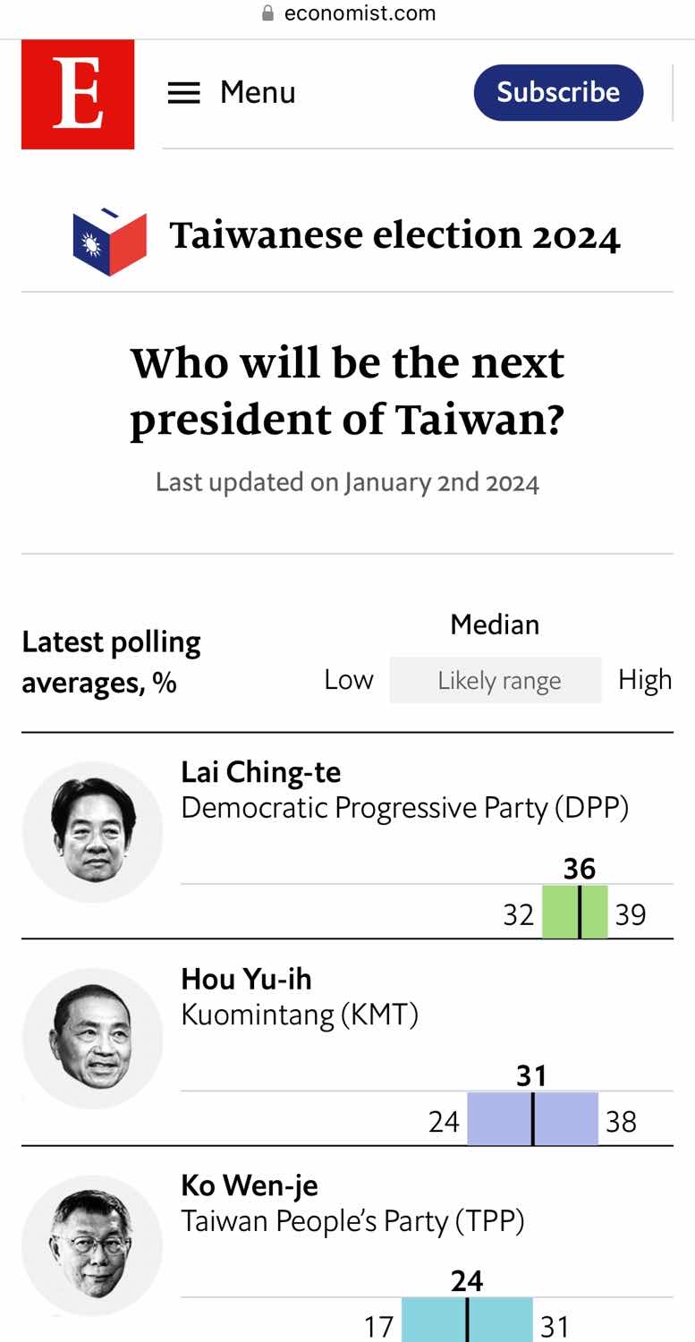 1월 13일 대만 총통, 부총통, 국회의원 선거가 치러져. 후덜덜하다 진짜. 대만은 국외 부재자 선거 제도가 없어. 국외 거주하는 대만인은 투표를 하려면 비행기를 타고 귀국해야 해. 실제 그런 경우가 많아서 귀환 투표자 수가 대선 변수가 되기도 해. 해외 거주 대만인은 200만. 사전투표도 없어. 총통 후보자는 부총통 후보자를 지명해서 러닝메이트로 선거를 치러. 한국 선거제도와 다른 점이야. 선거 전 마지막 여론조사에서 대만 독립을 지향하는 민진당 라이칭더 현 부총통이 1위 했어. 라이칭더는 대만 독립 의지가 가장 강한 후보야.
