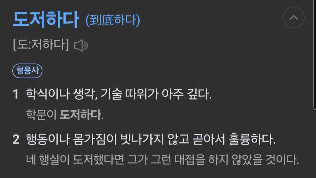 도저하다 1. 학식이나 생각, 기술 따위가 아주 깊다 "학문이 도저하다" 2. 행동이나 몸가짐이 빗나가지 않고 곧아서 훌륭하다 "네 행실이 도저했다면 그가 그런 대접을 하지 않았을 것이다"