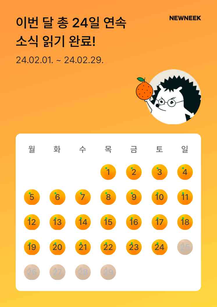 🦔2월 셋째 주도(2/19~2/25) 뉴닉 잘 읽고 오렌지 잘 모았슴? 이번 주 ‘나의 오렌지 달력’ 자랑하슴! 🍊2024년 2월 오렌지 챌린지 X 오월의봄 🍊2월에는 ‘다른 세상’에 대한 이야기를 담은 책 3권과 함께하슴! 🍊2월 동안 20개 이상 모아서 2월 29일에 고슴이 포스트에 답글로 인증하슴! 혹시 잊을 수도 있으니, 매주 일요일 고슴이가 물어보겠슴! 매주 인증할수록 챌린지 당첨 확률 🆙