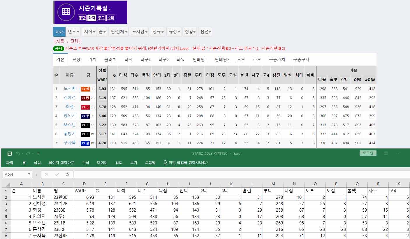#데이터로_보는_KBO_01 ⚾️ 안녕하세요, 크로와상입니다 👋 오늘부터 10주간 KBO 데이터를 분석해볼텐데요. 저는 ‘스탯티즈’라는 야구 통계 사이트에서 ‘파이썬’이라는 언어로 데이터를 ‘크롤링’해서 데이터셋을 만들었습니다. 📍스탯티즈가 궁금하신 분들은 들어가보세요 ! (http://www.statiz.co.kr/main.php) 💡크롤링이란? 웹 페이지를 그대로 가져와서 거기서 데이터를 추출해 내는 행위를 뜻합니다. [2023년 WAR 상위 150명]을 크롤링하여 csv파일로 만들어보았습니다. 웹과 동일하죠? 😎