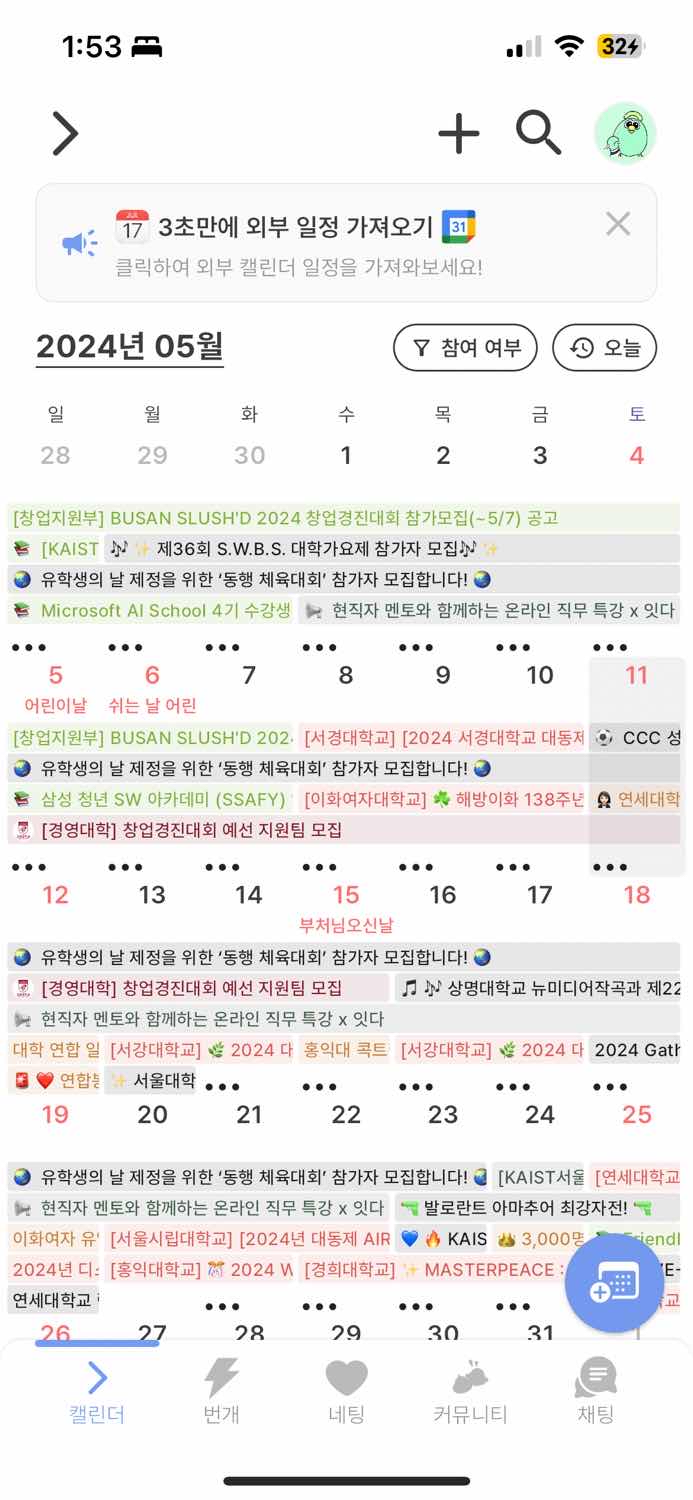 서비스 자판기 #8 – nety 대학생 분들에게 꽤 유용한 서비스라고 생각해서 가져온 nety(네티)입니다! 5월이 되고, 중간고사가 끝나면서 각종 학교 행사가 다시 활발하게 펼쳐지고 있는데요~ 각종 학교 행사에 대한 정보는 학교 메일로 날아오는 공지나 학교 건물 외내부의 포스터, 에브리타임 등의 커뮤니티를 통해 알 수 있지만 워낙 행사의 종류가 많고 다양해서 일일이 캘린더에 옮겨적지 않는 이상 기억하기 어려웠던 경험이 있고 이번 학기 역시 똑같은 문제를 느끼고 있었어요 🥹