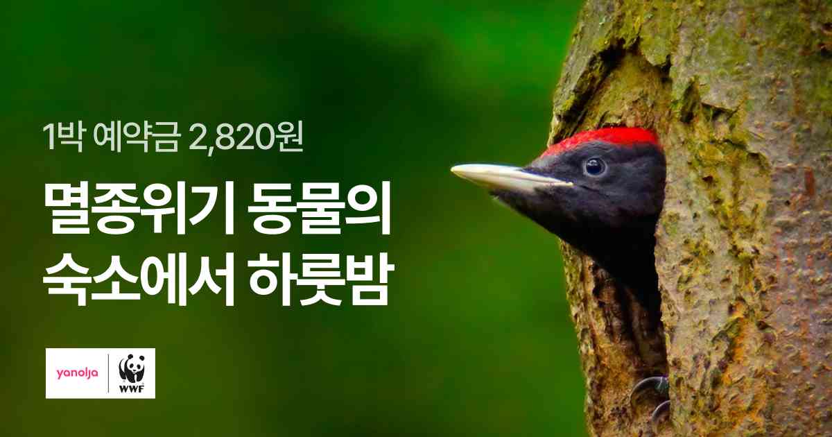 숙소 정보 페이지에서는 멸종 위기 동물과 서식지에 대한 상세한 정보도 볼 수 있고, ‘예약으로 후원하기’를 통해 기부에 참여하실 수 있어요. 숙소당 최소 기부 금액은 2,820원인데요, 이는 환경부가 지정한 국내 멸종 위기 야생생물 282종을 상징한다고 해요 캠페인에 대한 자세한 내용은 아래 링크에서 확인하실 수 있답니다 😊