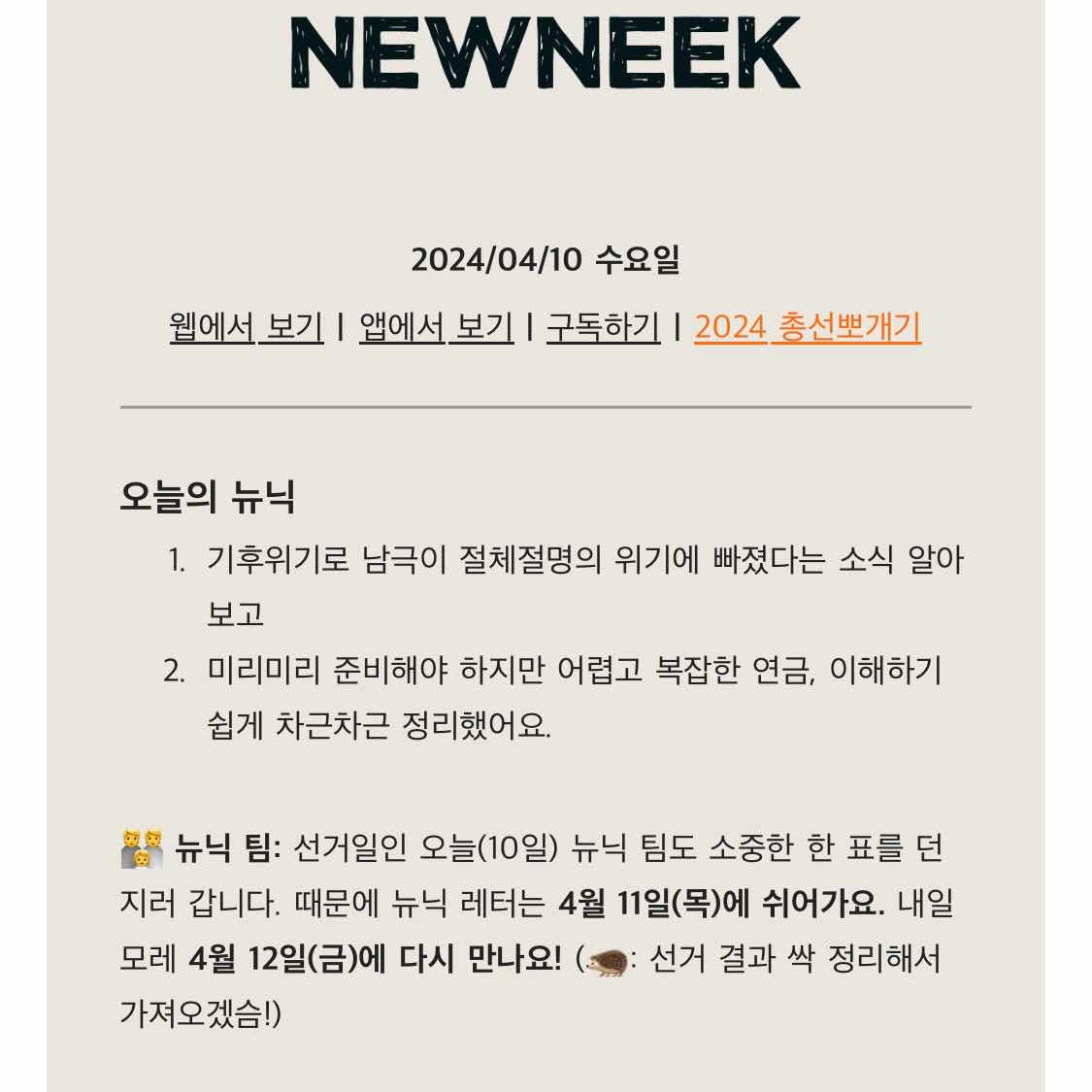 어제 레터에서 안내를 했었네요. 선거일이라 뉴닉팀도 쉬었대요!