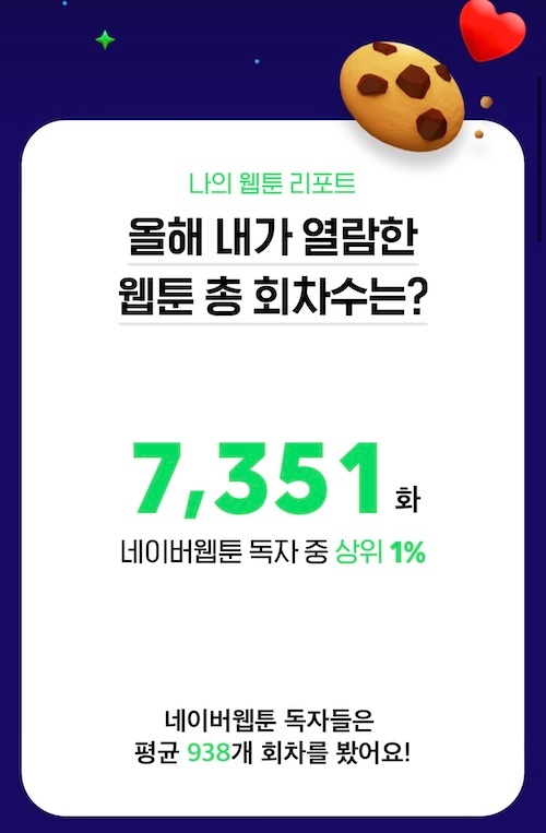 네이버웹툰에서는 연말마다 '올해 나의 웹툰 기록'을 정리해 보여주는 이벤트를 한다. 1년에 웹툰을 총 몇 편이나 봤는지, 제일 많이 본 작품은 뭔지 등을 알려주며 "축하합니다! 우리 플랫폼에 이렇게 많은 시간과 돈을 쏟아부으셨군요!" 해주는 이벤트. 심드렁하게 버튼을 누르자, 갑자기 '네이버웹툰 독자 중 상위 1%'라는 문구가 떴다. 이게 뭔가 싶은 마음에 눈을 비비고 다시 봐도 여전했다. 2022년 1년간 내가 본 웹툰 회차 수는 총 7351회, 네이버웹툰 전체 독자 중 상위 1%였다. 그리고 진짜 무서운 점은, 내 핸드폰에는 네이버웹툰 말고도 웹툰을 읽기 위해 깔아놓은 앱이 최소 세 개는 더 있다는 거였다.