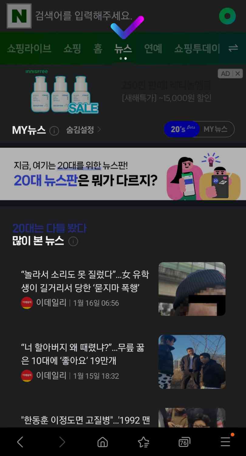 λͺ¨λ°μΌ κΈ°μ€ μ²« ννλ©΄μμ 보μ΄λ <λ΄μ€ν> λ€μ΄κ°μλ©΄ λ΄μ€ν μμμλ 2μ±ν°λ‘ λλμ΄μ Έ 보μ¬μ. (μλ¨ μΉ΄ν