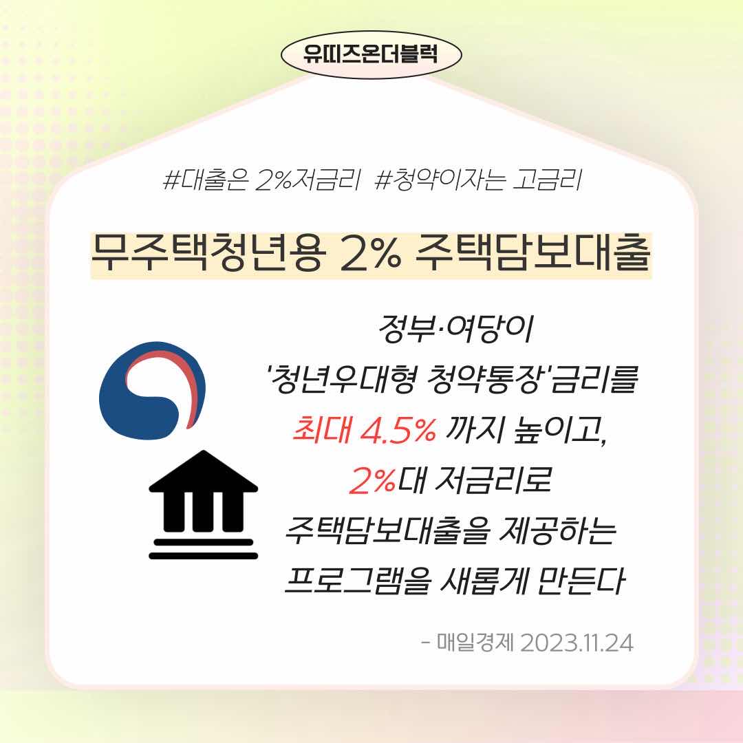 2️⃣ 청약 통장 가입자들에게 2% 저금리로 주택담보대출(주담대)을 제공하는 프로그램을 새롭게 만들겠다.