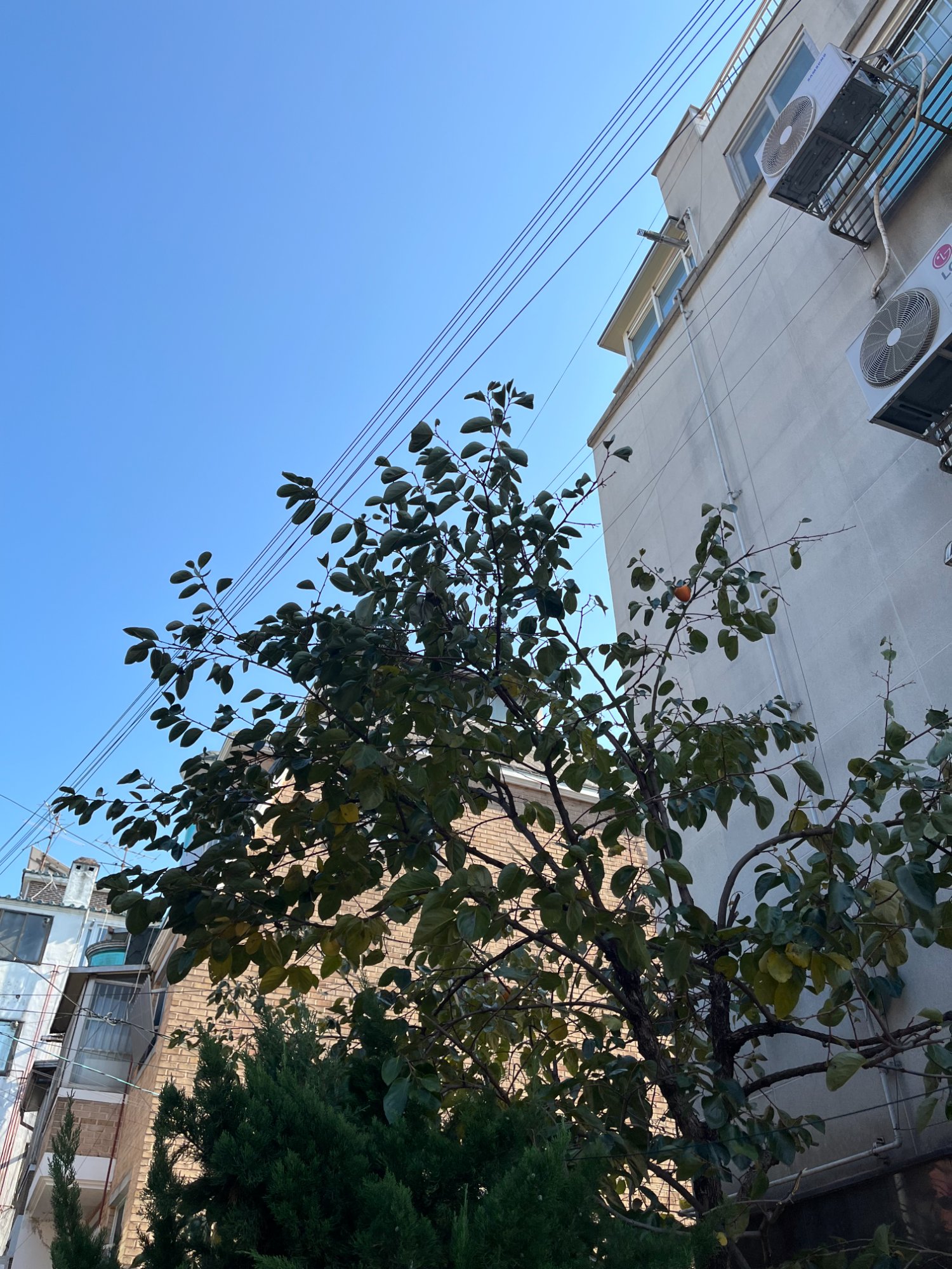 시멘트로 가득하고 답답한 공간에서, 애쓰며 가꾸고 돌보지 않았지만 잘 자라게 해 준 하늘님께 감사하는 마음으로 남겨 놓은 감 하나.