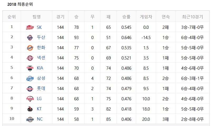 업셋은 정규시즌 하위 순위의 팀이 포스트시즌에서 상위 순위의 팀을 이기는 것을 말해요. 특히 한국시리즈에서 업셋이 일어난 경우, 정규시즌 순위가 바뀐다는 사실! 때문에 아래와 같이 게임차가 ‘- (마이너스)’로 표기된 순위표가 만들어지기도 해요.