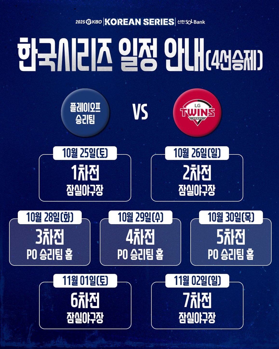 * 작년 기준: 1, 2, 5, 6, 7차전 1위팀 홈구장 / 3, 4차전 플레이오프 승리팀 홈구장