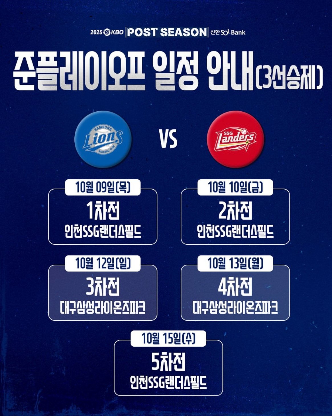 삼성 라이온즈가 와일드카드 결정전에서 승리하며 SSG 랜더스와 삼성 라이온즈의 준플레이오프 대진이 확정되었어요!