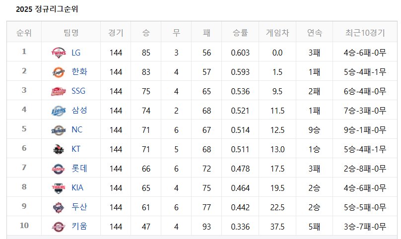 이번 2025 포스트시즌에서는 5위팀 NC 다이노스가 첫번째 경기를 승리하며 두번째 경기가 열렸어요. 그리고 두번째 경기에서 4위팀 삼성 라이온즈가 승리하며 준플레이오프 진출을 확정지었습니다💡