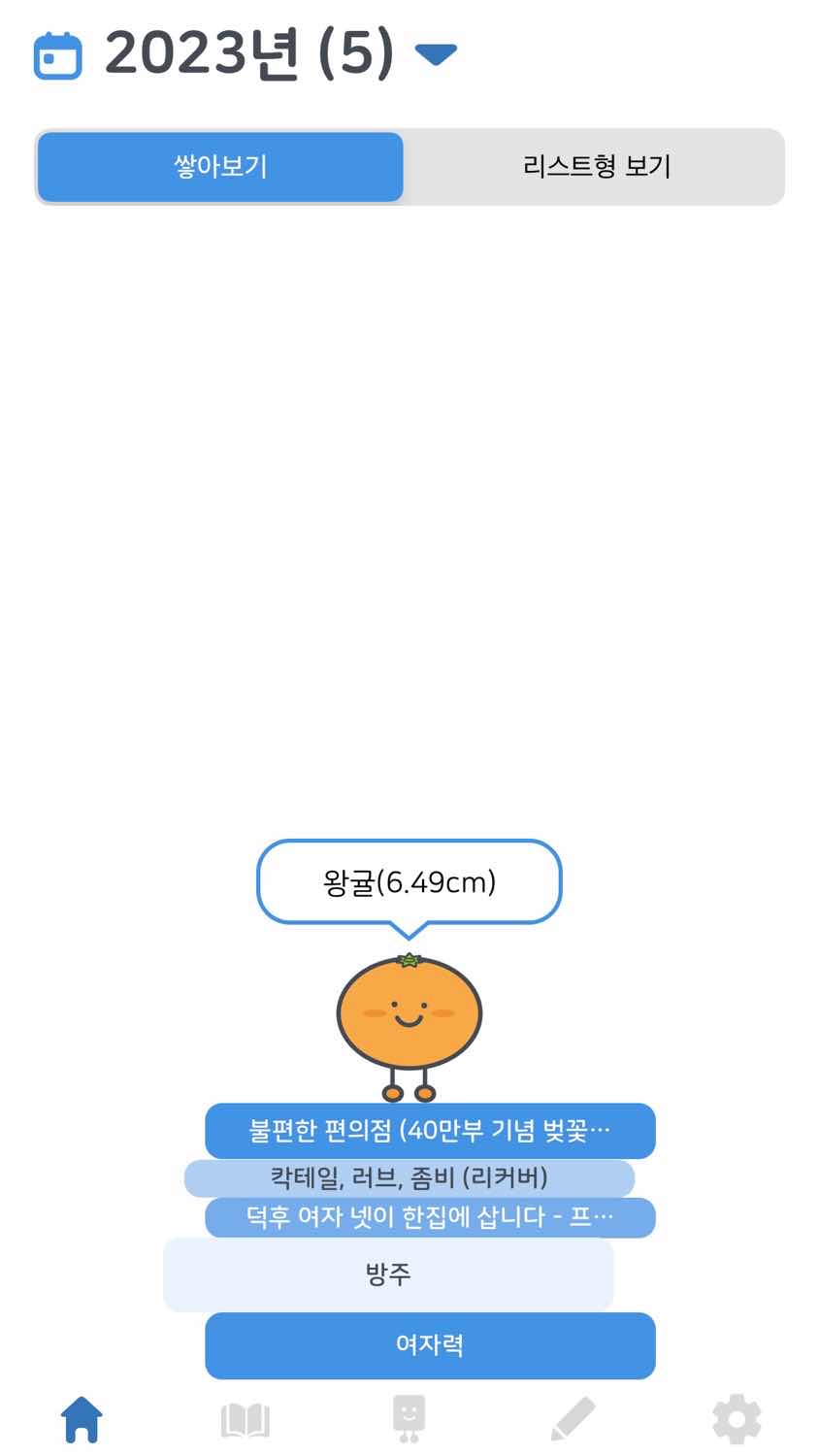 대신 먼저 답변해드리자면 "북적북적"이라는 어플입니다.....! 읽은 책 높이에 따라 캐릭터를 얻을 수 있어요~! 제 소박한 왕귤을 보여드립니다...🧐