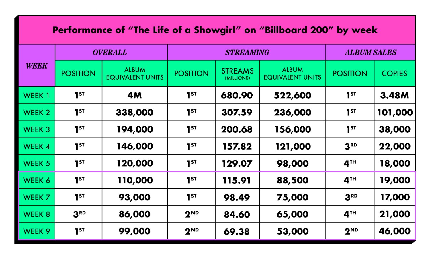 11월 5주 차 차트까지 테일러 스위프트의 앨범 ‘The Life of a Showgirl’과 노래 ‘The Fate of Ophelia’가 빌보드 200과 핫 100을 7주 연속 석권했다. 두 차트에서 동시에 1위로 데뷔한 사례는 역사상 16번에 불과하고, 그중 7주 연속은 압도적인 최장 기록이다.