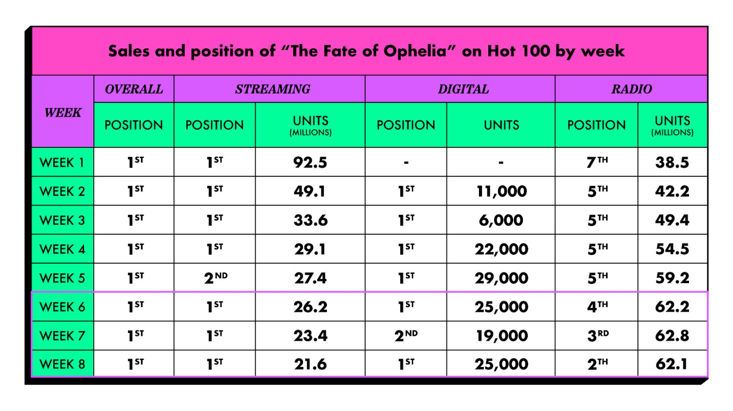 ‘The Fate of Ophelia’는 앨범 순위와 무관하게 꾸준히 정상을 지키면서 데뷔 이후 8주 연속 1위 기록을 남겼다. 빌보드 역사에서 핫 100 1위로 데뷔한 노래는 86곡이다. 그중 ‘The Fate of Ophelia’의 첫 8주 연속 1위는 역대 공동 5위 기록에 해당한다. 머라이어 캐리와 보이즈 투 맨의 ‘One Sweet Day’가 첫 16주 연속 1위로 가장 길다. 비교적 최근 기록과 비교하면, 2018년 드레이크의 ‘God’s Plan’이 첫 11주간 1위, 2021년 올리비아 로드리고의 ‘drivers license’가 첫 8주간, 방탄소년단의 ‘Butter’가 첫 7주간 1위였다.