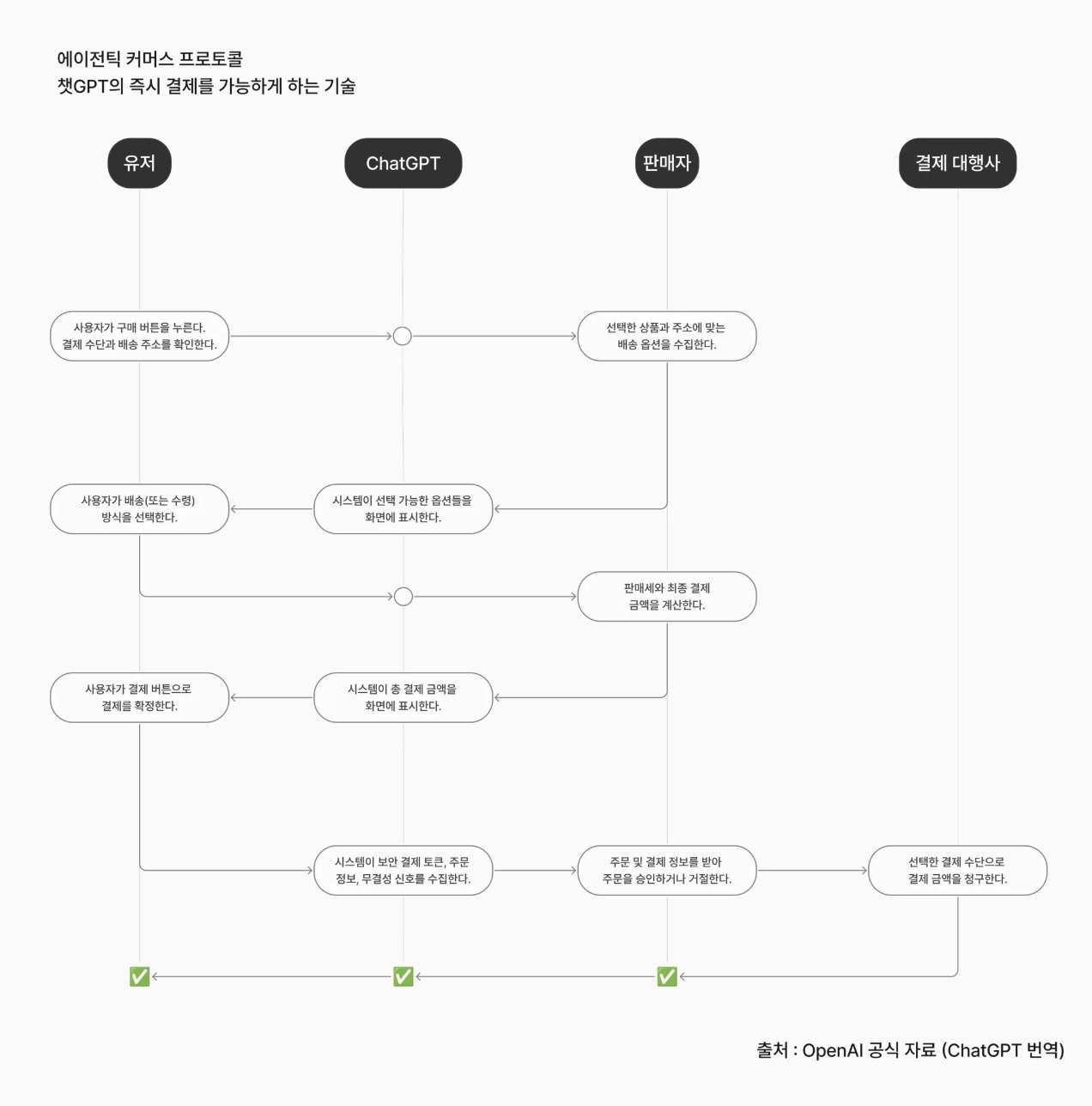 ‘즉시 결제’의 핵심에는 오픈AI가 새롭게 선보인 에이전틱 커머스 프로토콜(Agentic Commerce Protocol, ACP)이 있어요. ACP는 AI가 제품 검색부터 결제, 주문 승인까지의 상거래 과정을 자동으로 수행할 수 있도록 규정한 기술 표준이에요. 이 프로토콜은 AI가 단순히 제품을 추천하는 수준을 넘어, 사용자·판매자·결제 시스템이 상호작용하는 개방형 표준(Open Standard)을 구축하기 위해 고안됐어요. 오픈AI는 이를 미국 핀테크 기업 스트라이프(Stripe)와 공동 개발했고, 일부 코드를 공개할 예정이에요. 즉 챗GPT가 소비자의 대화 맥락을 기반으로 상품을 제안하면, ACP는 뒤에서 거래 절차를 자동으로 처리해주는 ‘AI 유통 인프라’ 역할을 담당해요.