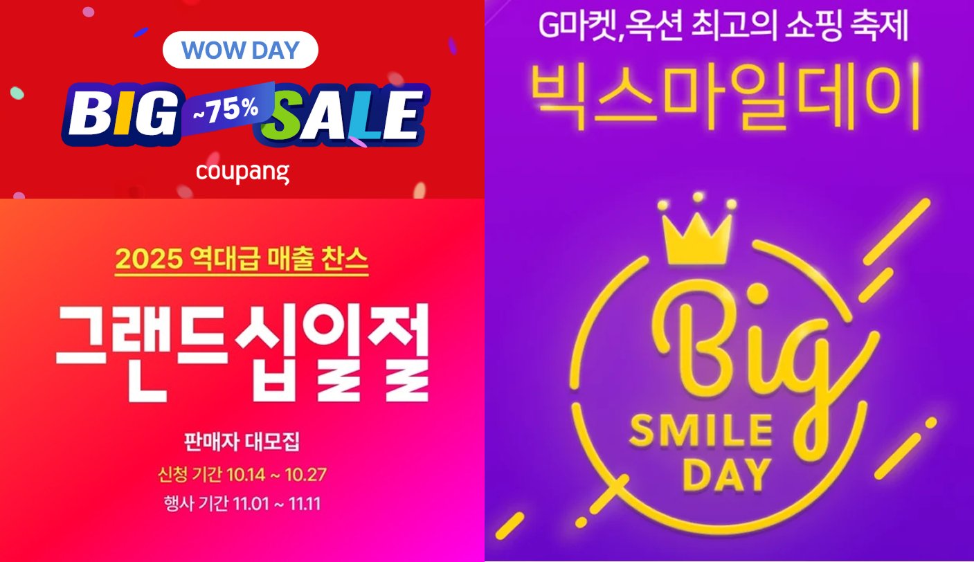 11월은 ‘빅스마일데이(지마켓/옥션)’와 ‘그랜드십일절(11번가)’이 겹치는 온라인 쇼핑의 최대 성수기예요. 대형 플랫폼들은 소비자 대상 할인 경쟁만큼이나 판매자 모집에 사활을 걸고 있어요. 특히 올해는 셀러 유치를 위해 예년과 다른 조건들을 앞다퉈 내세우며, 단순 노출보다는 운영비 절감이나 매출 증대에 실질적인 도움이 되는 구조를 만들고 있어요.