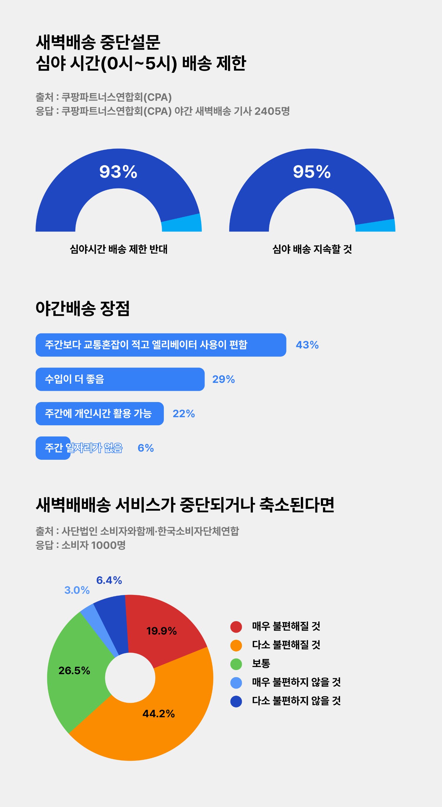 실제 현장의 의견은 더욱 다양해요. 쿠팡파트너스연합회가 2,405명을 대상으로 실시한 설문에 따르면 93%가 새벽배송 금지에 반대했어요. 기사들은 “심야노동이 힘든 건 사실이지만, 문제는 시간대보다 과로 구조”라며 제한보다 근무 환경 개선이 우선이라고 말했어요. 일부 기사들은 “야간 근로를 없애면 수입이 줄고 생계가 어려워진다”고 우려했어요.