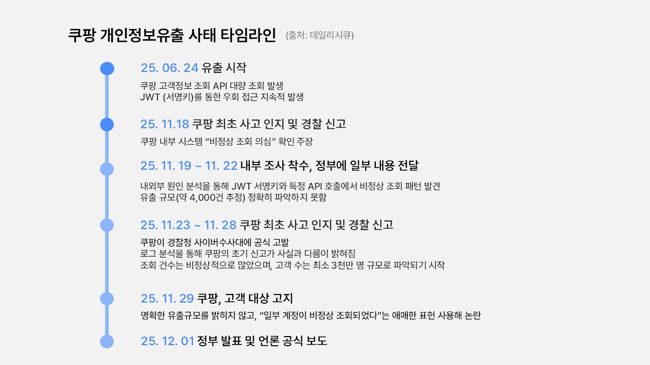 회사의 대응은 ‘무능’을 넘어 ‘은폐’ 의혹까지 사고 있어요. 쿠팡은 11월 6일 시스템에서 첫 이상 징후가 포착되었음에도 이를 묵살했고, 11월 18일 한 고객이 “내 정보가 유출된 것 같다”고 신고한 후에야 뒤늦게 사태를 파악했거든요. 심지어 당국에 첫 신고를 할 때는 피해 규모를 4천여 건으로 축소 보고했다가, 정밀 조사 후 11월 29일에서야 3천만 명 규모임을 실토했는데요. 결국 회사가 지켜야 할 기본 수칙 하나를 어겨서 전 국민의 개인정보가 공공재가 되어버린 셈이죠.