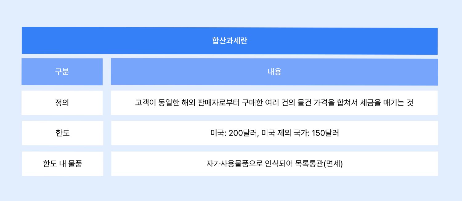 합산과세는 말 그대로 고객이 구매한 여러 건의 물건 가격을 '합쳐서' 세금을 매기는 것을 말해요. 이때 고객이 구매한 상품 가격이 면세 한도(미국 $200, 그 외 $150)를 넘으면 대행업자는 관세와 부가세를 내야 해요.