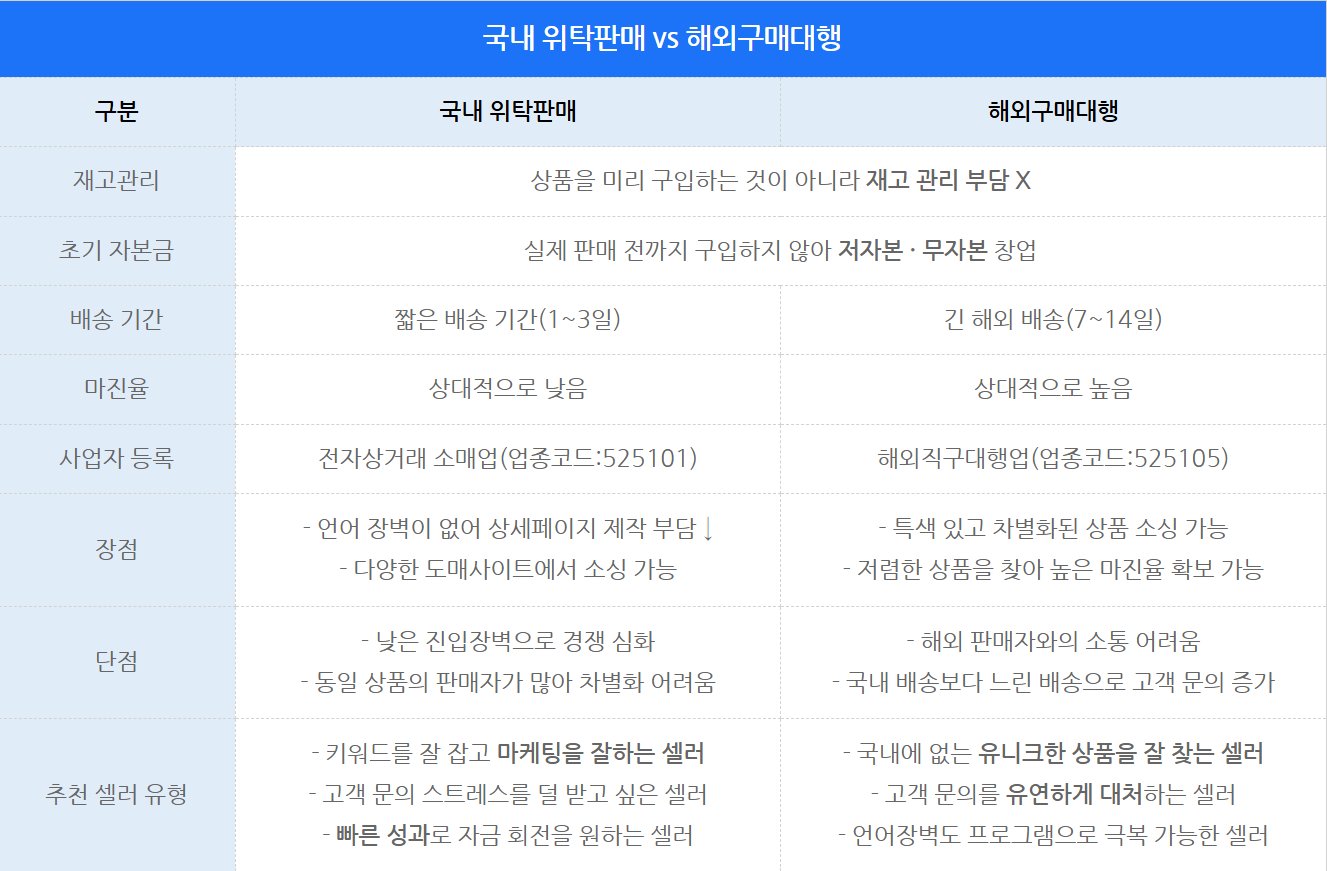 그럼 국내 위탁판매와 구매대행 중 어떤 사업을 시작할지 한눈에 비교하실 수 있게 표로 살펴볼게요.