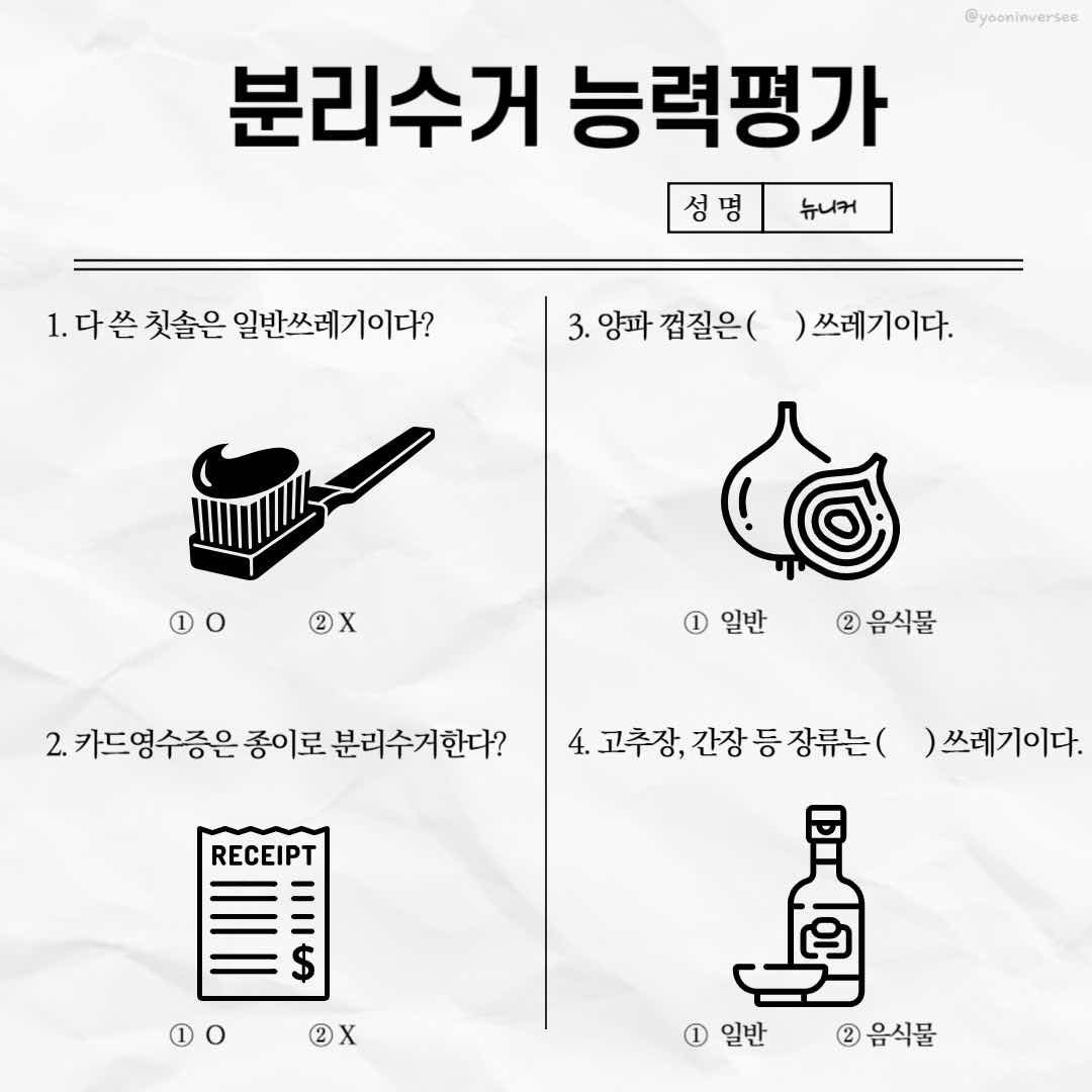 안녕하세요 뉴니커 여러분들 ₍ᵔ· ̫·ᵔ₎ 분리수거 능력평가 간단하게 만들어 보았어요! 풀어보시고 댓글에 남겨주세요~