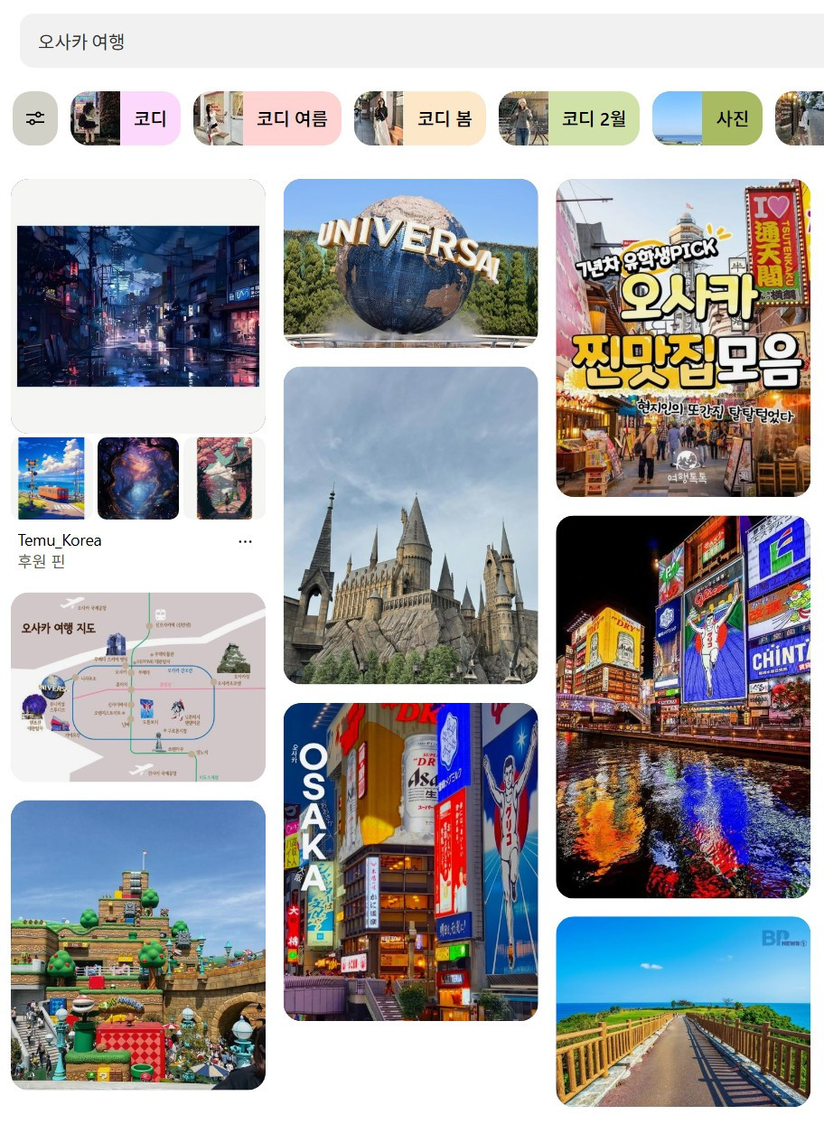 감성에서 실용으로: 사용자들은 여행지의 무드를 정하는 것에서 시작해, 짐 싸기 팁, 상황별 코디, 맛집 리스트까지 모든 준비 과정을 핀터레스트 보드로 해결해요. 감성으로 시작해 실용으로 이어지는 거죠.